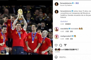 托雷斯社媒寫道:“15年前,我們一起在南非成為了世界冠軍,那一天的美好回憶載入史冊(cè)!”