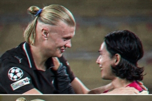 哈蘭德與南野拓實(shí)擁抱寒暄,此役哈蘭德為曼城打進(jìn)2球,而效力于摩納哥的南野拓實(shí)擔(dān)任替補(bǔ)未能出場(chǎng)。