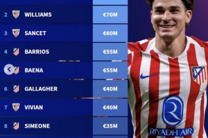 西甲非皇馬巴薩球員身價(jià)前十(單位歐元):