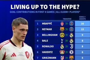 德轉(zhuǎn)“惡趣味”地統(tǒng)計了轉(zhuǎn)會費上億歐元的攻擊手們?yōu)樾虑蜿牫鰬?zhàn)前8場比賽,在進球+助攻上的貢獻榜單。姆巴佩、內(nèi)馬爾、貝林厄姆分列前3,而最后一名可謂是為了這碟醋才包的這盤餃子...