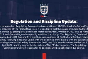 獨立監(jiān)管委員會已對AFC溫布爾登球員奧斯曼-福約違反博彩條例的行為作出處罰。據指控,該球員在2023年10月29日至2025年3月28日期間對足球比賽進行投注,違反英足總E8條例252次。
