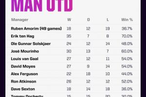 對(duì)陣桑德蘭的比賽將是阿莫林執(zhí)教曼聯(lián)的第50場(chǎng)比賽,但他的5位前任莫耶斯、范加爾、穆里尼奧、索爾斯克亞和滕哈赫,都沒(méi)能在執(zhí)教曼聯(lián)的50場(chǎng)里程碑取得勝利。
