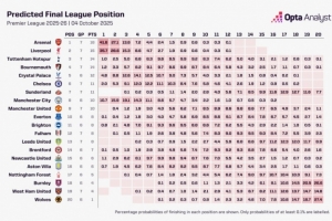 阿森納41.6%概率捧杯,27.1%亞軍,13.6%季軍。