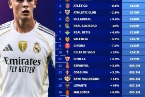 體育資訊10月5日訊 德轉此前更新了西甲球員身價,并盤點了目前西甲球隊身價榜,具體如下: