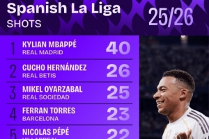 體育資訊10月7日訊 日前,Squawka統(tǒng)計(jì)了本賽季西甲射門次數(shù)排行,姆巴佩以40次射門居首。