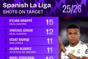 體育資訊10月7日訊 日前,Squawka統(tǒng)計(jì)了本賽季西甲射正次數(shù)排行,姆巴佩15次居首。
