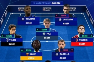 前鋒:圖拉姆(國(guó)際米蘭,7500萬(wàn)歐元)、勞塔羅(國(guó)際米蘭,8000萬(wàn)歐元)