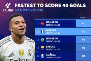 下一篇: 1990年以來(lái)最快達(dá)成西甲40球排名:C羅41場(chǎng)居首,姆巴佩42場(chǎng)次席