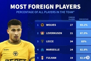 體育資訊7月13日訊 《轉(zhuǎn)會市場》統(tǒng)計了當前五大聯(lián)賽一線隊外援占比情況,狼隊是唯一超過9成的球隊。