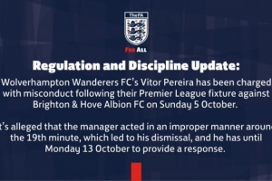 日前,英足總官方發(fā)布公告:“狼隊(duì)主帥佩雷拉在10月5日周日對陣布萊頓的英超聯(lián)賽后被指控行為不當(dāng)。據(jù)稱,佩雷拉在第19分鐘左右行為不當(dāng),這導(dǎo)致他被罰下場,他需在10月13日周一前對此作出回應(yīng)。”