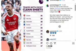 同期,排名第二的是曼城,他們有29場比賽零封,上賽季奪冠的利物浦則是有26場比賽零封,排名第五。