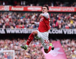 英超第4輪在酋長(zhǎng)球場(chǎng)迎戰(zhàn)諾丁漢森林的比賽第31分鐘,蘇維門(mén)迪在禁區(qū)弧頂位置奉獻(xiàn)了一記非常精彩的凌空斬,打進(jìn)了自己加盟阿森納的處子球,幫助球隊(duì)取得1-0的領(lǐng)先。
