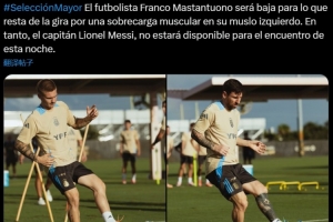 阿根廷官方寫道:“球員馬斯坦托諾的左大腿肌肉過度疲勞,將缺席接下來的巡回比賽。與此同時(shí),隊(duì)長(zhǎng)梅西也將缺席今晚的比賽?!?/p>