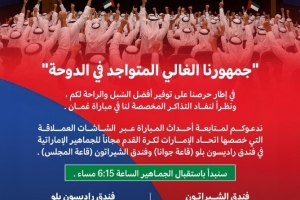 我們邀請您在阿聯(lián)酋足球協(xié)會為阿聯(lián)酋球迷免費提供的位于麗笙酒店(喬安娜廳)和喜來登酒店(馬吉利斯廳)的巨型屏幕上關(guān)注比賽動態(tài)。我們將于18:15(22:15)開始接待公眾?!?/p>