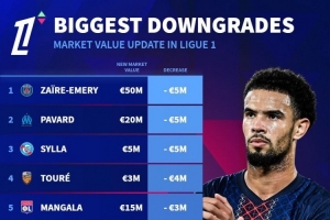 體育資訊10月12日訊 德國(guó)轉(zhuǎn)會(huì)市場(chǎng)更新了法甲球員的身價(jià),并列出身價(jià)下跌排名,扎伊爾-埃梅里、帕瓦爾、西拉-500萬(wàn)歐居首。