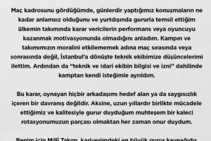 當(dāng)看到比賽名單時(shí),我才意識(shí)到這些天來的溝通毫無意義——那些在海外為國(guó)爭(zhēng)光的球員,在國(guó)家隊(duì)決策者眼中,其表現(xiàn)和斗志根本不被重視。為避免影響集訓(xùn)營(yíng)和球隊(duì)士氣,我選擇在返回伊斯坦布爾后向技術(shù)團(tuán)隊(duì)傳達(dá)了我的想法,而非在比賽期間或賽后,隨后在‘技術(shù)和管理團(tuán)隊(duì)知情并同意’的情況下,我自愿離開了集訓(xùn)營(yíng)。