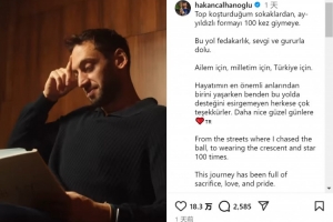 恰爾汗奧盧達(dá)成國家隊出戰(zhàn)100場里程碑,他在社交媒體上寫道:“從在街頭追逐足球,到身披星月戰(zhàn)袍(土耳其隊球衣)出戰(zhàn)百場。這段旅程充滿了犧牲、熱愛與驕傲。為我的家人,為我的祖國,為土耳其。”