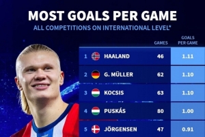 體育資訊10月13日訊 德國(guó)轉(zhuǎn)會(huì)市場(chǎng)統(tǒng)計(jì)了足壇歷史球員在國(guó)家隊(duì)的場(chǎng)均進(jìn)球數(shù)量,并列出榜單,哈蘭德1.11球居首,蓋德-穆勒、柯奇士次席。
