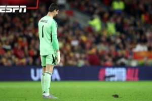 體育資訊10月14日訊 在今天凌晨進(jìn)行的世界杯預(yù)選賽,比利時國門庫爾圖瓦試圖在球場上抓住一只老鼠。