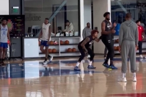 體育資訊10月15日訊 在今天的76人隊內(nèi)訓(xùn)練中,恩比德與隊友輪流進(jìn)行一對一的單挑。