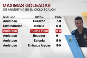 體育資訊10月15日訊 阿根廷隊(duì)友誼賽6-0大勝波多黎各,根據(jù)統(tǒng)計(jì),6-0是斯卡洛尼執(zhí)教阿根廷隊(duì)的第二大比分勝利。