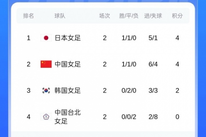 目前,中國女足與日本女足同積分4分,但因凈勝球劣勢,日本女足暫居第1,中國女足位列第2。韓國女足2連平第3,中國臺北女足2連負位列墊底。