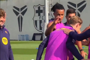 體育資訊10月16日訊 巴薩球員在訓練時列隊歡迎德容和費爾明,并對他們致以拍頭禮進行祝賀。