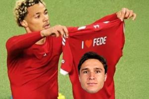 埃基蒂克曬出自己在對陣南安普頓的比賽中脫衣慶祝的照片,并在球衣上加上了小基耶薩的頭像,并配文“我??費德(費德里科-基耶薩的昵稱)”。