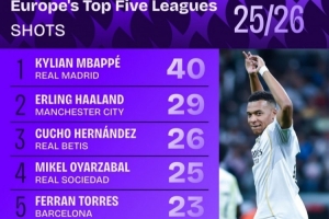 五大聯(lián)賽球員本賽季射門次數(shù)榜:姆巴佩40次第一,哈蘭德29次第二