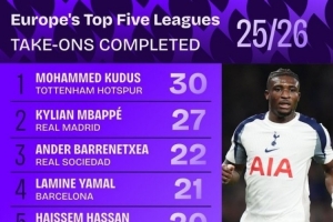 歐洲五大聯(lián)賽 25/26 賽季成功過(guò)人榜