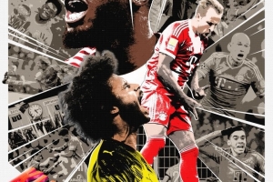 海報是充滿張力的拼貼畫風格,拜仁后衛(wèi)于帕梅卡諾、凱恩一同出鏡,背景還有昔日對決瞬間。