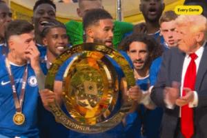賽后頒獎儀式上,切爾西準備捧杯之際,特朗普一直站在中間。切爾西球員桑切斯對其說了幾句話,因凡蒂諾也向其示意。