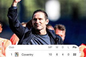 蘭帕德的球隊(duì)近4場(chǎng)比賽豪取4連勝且1球沒丟,4場(chǎng)一共打入14球:3-0伯明翰、4-0米爾沃爾、5-0謝菲爾德星期三、2-0布萊克本。目前6勝4平的考文垂以22分力壓米德爾斯堡,領(lǐng)跑英冠。