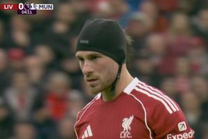 比賽剛開始姆伯莫破門,在進(jìn)球前的爭(zhēng)頂,范迪克爭(zhēng)頂中肘擊麥卡利斯特。之后麥卡接受治療,頭上戴上了帽子繼續(xù)比賽。