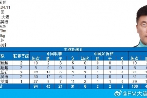 體育資訊10月20日訊 據(jù)博主“FM大連球隊(duì)調(diào)查員”統(tǒng)計(jì),10月19日,大連英博0-0武漢三鎮(zhèn)的比賽,大連英博隊(duì)主教練李國旭完成各項(xiàng)俱樂部職業(yè)賽事執(zhí)教100場的里程碑。