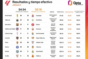體育資訊10月21日訊 OPTA統(tǒng)計(jì)了西甲第九輪各場比賽的有效時(shí)間,沒有任何一場比賽的有效時(shí)間超過60分鐘。