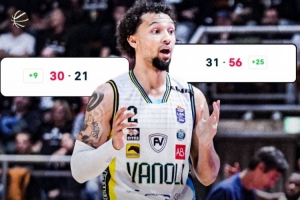 比賽中,克雷莫納打出一波史詩(shī)級(jí)別的進(jìn)攻高潮,第二節(jié)還剩7分05秒時(shí),他們21-30落后博洛尼亞9分,在隨后的10分半鐘,他們打出一波35-1的進(jìn)攻高潮。而在這次進(jìn)攻高潮中,博洛尼亞這一分也是直到第三節(jié)7分35秒才拿到。