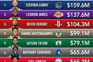 下一篇: 本年度球星收入排行:庫(kù)里1.596億居首 詹姆斯1.376億居次 KD第三