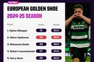 本賽季歐洲金靴積分: