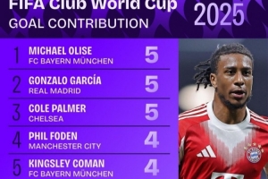 5球,奧利塞(拜仁)、貢薩洛-加西亞(皇馬)、帕爾默(切爾西)