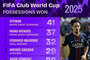 體育資訊7月14日訊 2025年首屆新版世俱杯以切爾西最終問鼎而落下帷幕。據(jù)Squawka數(shù)據(jù)統(tǒng)計,世俱杯成功搶斷榜單中,巴黎維蒂尼亞以41次搶斷高居榜首。