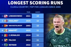 2.哈蘭德,2025年,連續(xù)12場(chǎng)進(jìn)球(當(dāng)前紀(jì)錄)