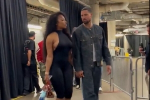 賽后,克萊手牽手?jǐn)y女友馬冬梅離場(chǎng)。