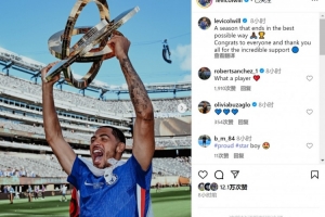科爾維爾社媒曬出高舉獎杯的照片,配文:“一個以最完美方式收官的賽季,祝賀所有人,感謝大家給予的非凡支持?!?/p>