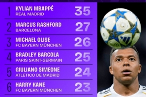 體育資訊10月23日訊 本賽季歐冠聯(lián)賽階段已戰(zhàn)罷3輪,Squawka統(tǒng)計了到目前為止對方禁區(qū)內觸球次數(shù)榜單,姆巴佩35次第一,拉什福德27次第二。
