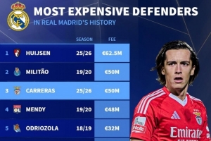 皇馬隊史引進后衛(wèi)轉(zhuǎn)會費排名:
