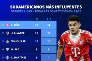 體育資訊10月24日訊 德國轉會市場統(tǒng)計了本賽季五大聯(lián)賽南美球員的參與進球數(shù)量,并列出榜單,路易斯-迪亞斯參與11球居首,阿爾瓦雷斯、維尼修斯參與10球次席。