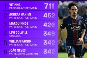 世俱杯傳球排名:維蒂尼亞711次斷層領(lǐng)先,前十巴黎占7位