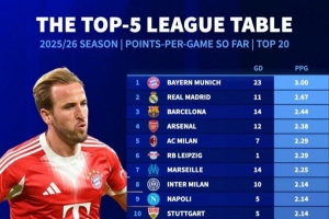 本賽季五大聯(lián)賽場(chǎng)均拿分榜(及凈勝球數(shù)):