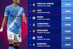 體育資訊10月25日訊 德轉(zhuǎn)盤點了在2025年足壇球員身價跌幅榜,其中福登下跌6000萬歐最多,以下為具體榜單: